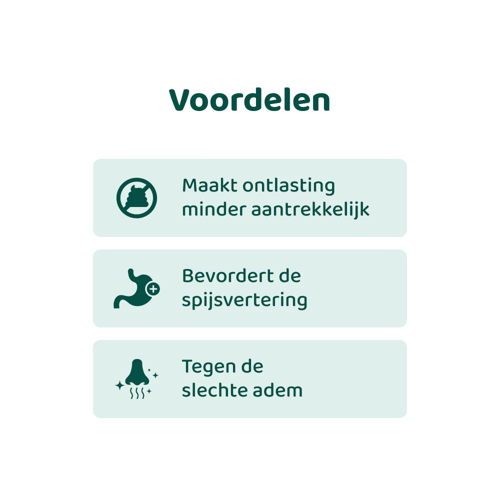 Deze smakelijke snoepjes zijn populair bij baasjes die hun hond willen helpen bij ongewenst eetgedrag. De natuurlijke ingrediënten zorgen dat ontlasting minder aantrekkelijk wordt qua geur en smaak, zelfs die van andere honden. Hierdoor kan je hond de link tussen poep en “beloning” (smaak/geur) losser gaan zien, wat het makkelijker maakt om dit gedrag af te leren.